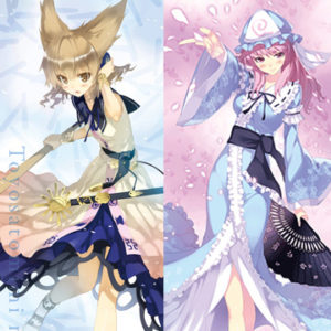 前回の博麗神社例大祭で頒布した東方アレンジ新譜「伝唱 -でんしょう-」「境懐 -キョウカイ-」セットお求め会場限定特典・秦こころ&射命丸文の2枚セットは